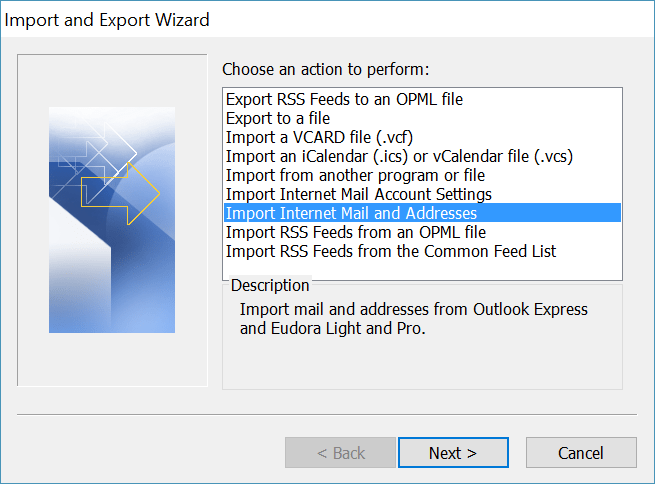 Step 3: in Import and Export Wizard Select Import Internet Mail and Address option.