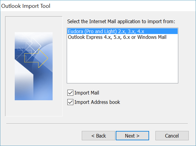 Step 4: Then select Eudora (Pro and Light) 2.x, 3.x, 4.x option and tick checkboxes named Import Mail, Import Address book. Hit Next button to finish importing.
